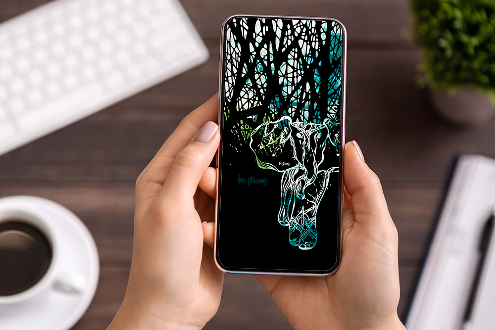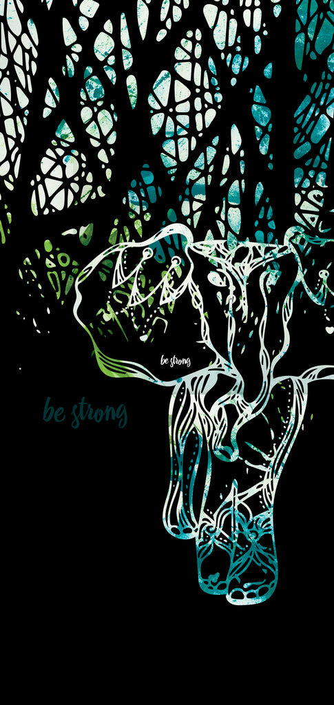 Be Strong. What other animal than an elephant exudes such beauty and strength while being gentle and calm? This is an illustration of an elephant adorned in jewels, which is set against an abstract forest backdrop. The stark contrast of black and white is set off with highlights of colours radiating from the forest scene.